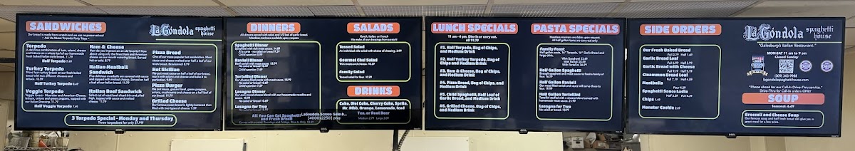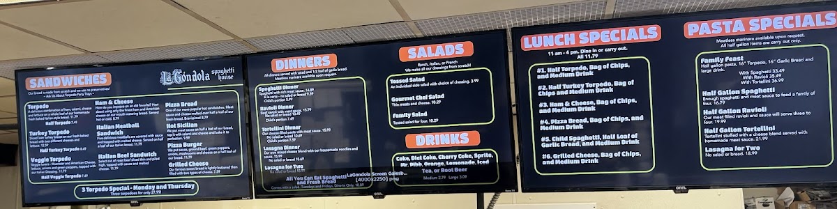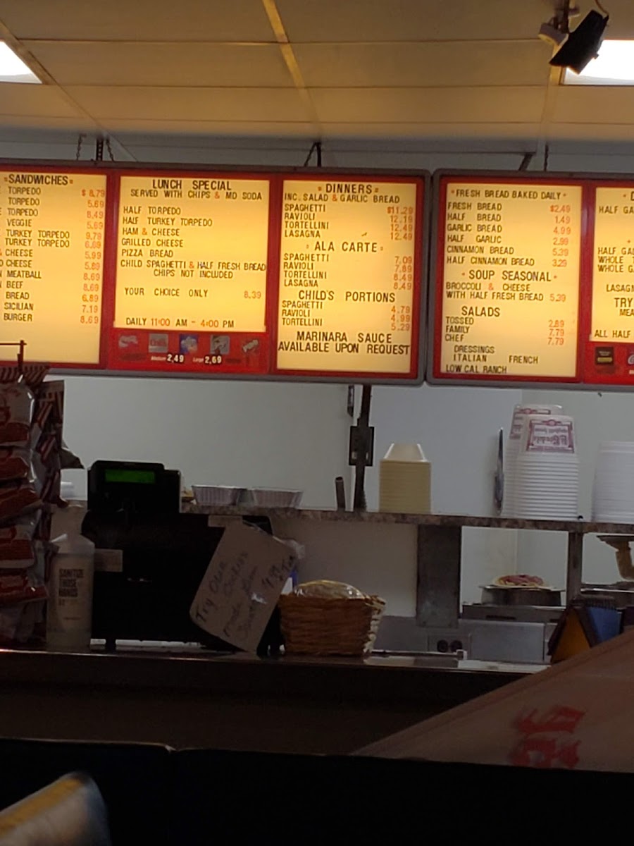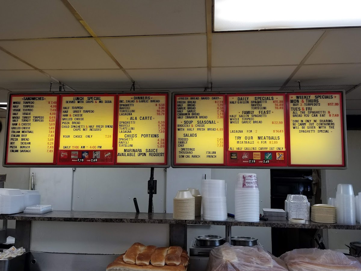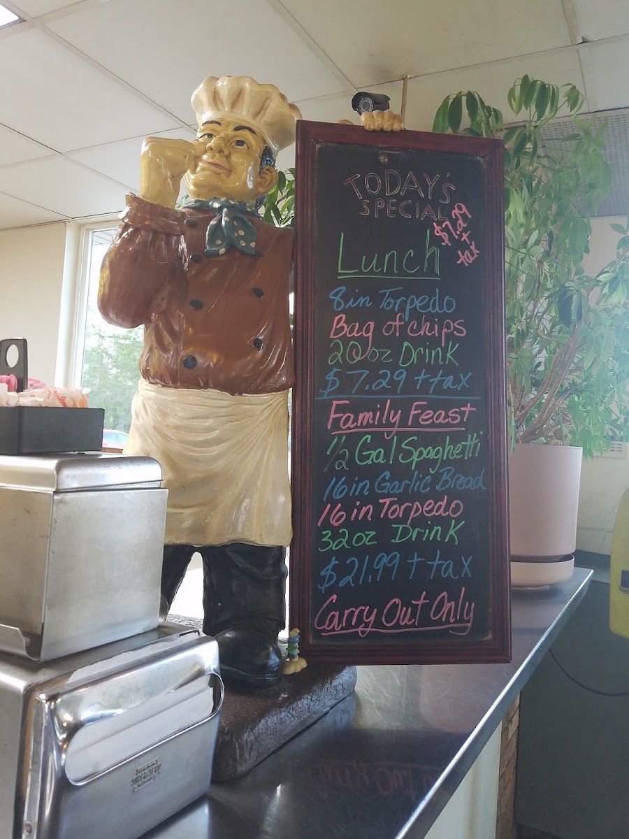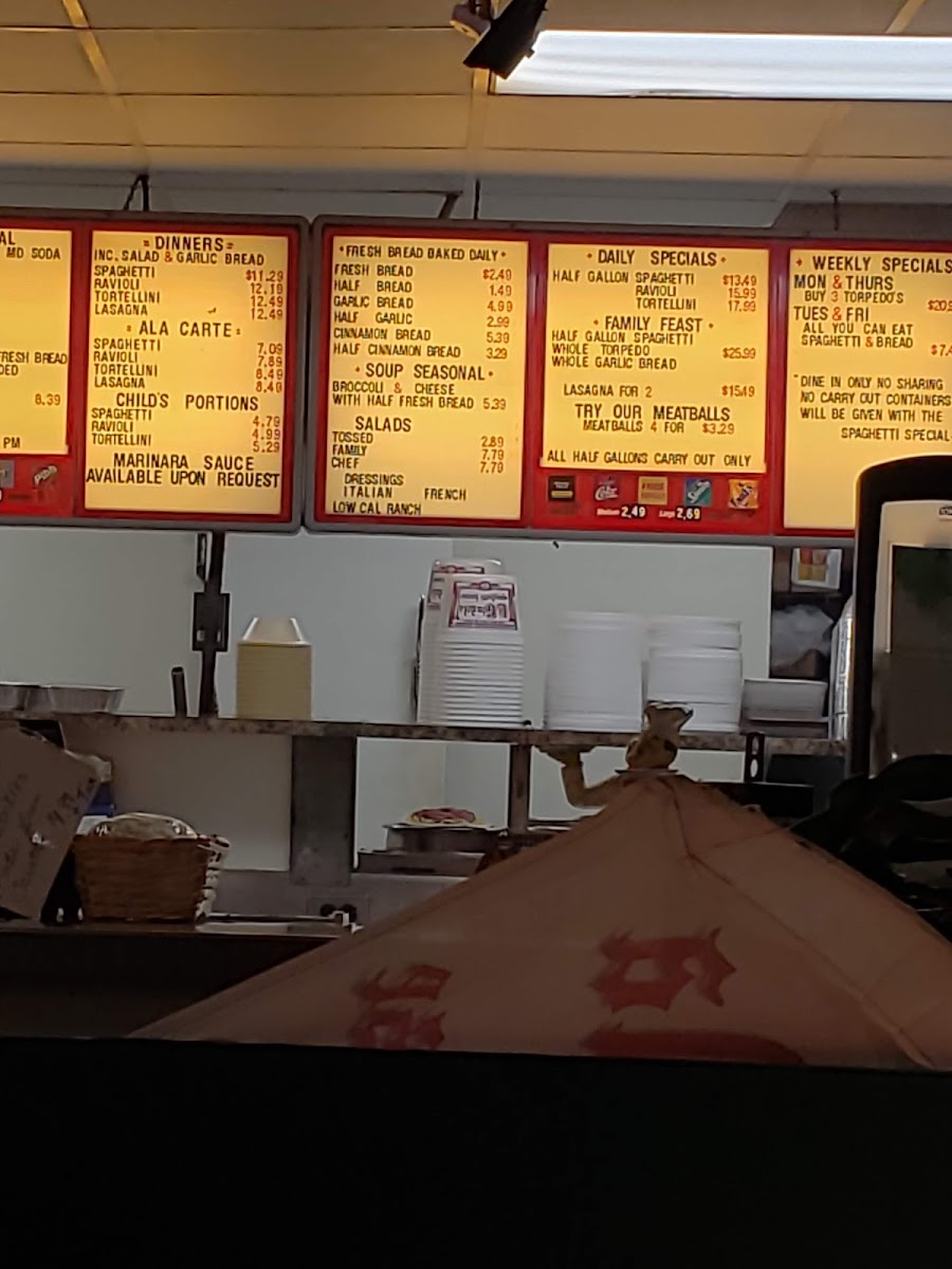 Half gallon spaghetti, sixteen-inch garlic bread, sixteen-inch torpedo, and large fountain drink.